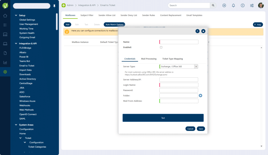 The Exchange Email Service monitors a predefined mail account and processes all messages received to that account, converting them to new tickets that appear in the “Pending” queue in the ticket system areas.