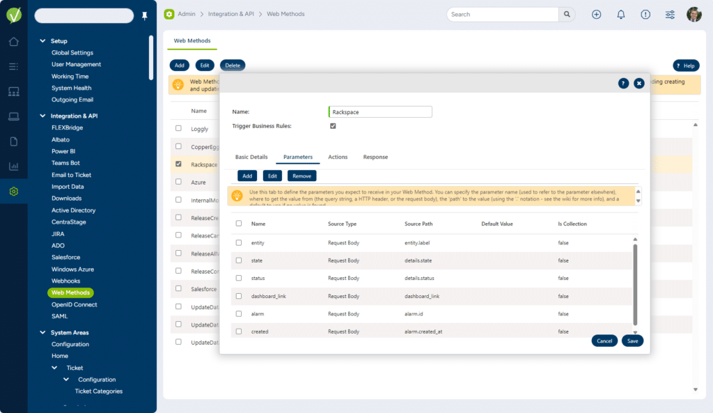 Setting up a Web Method in Vivantio to receive the initial alert and updates to that alert allows you to seamlessly; create, update or close tickets that are linked to that alert in Rackspace. The calling of the Web Method can also trigger Vivantio business and escalation rules as required. All information can be stored in Vivantio’s core or customer fields and linked to assets or callers to provide the service and support team a full picture of the issue.